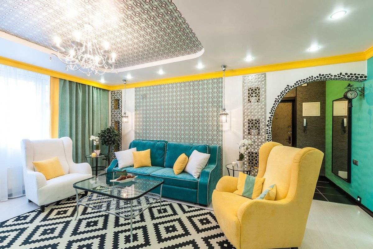Желтый диван в интерьере кухни-гостиной