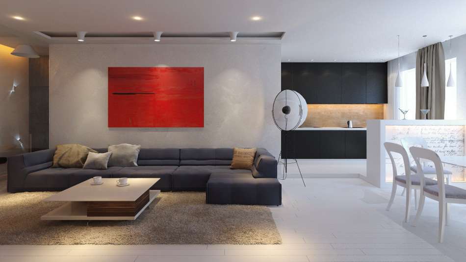 Чтобы интерьер не казался слишком блеклым, его можно оживить живыми растениями в горшках или парой ярких аксессуаров — подушками на диване, вазой, настенным панно и пр. Минимализм отлично подходит для интерьеров эконом-класса.