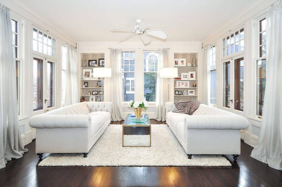 В большой, вытянутой гостиной два дивана выставленные вдоль и в один ряд, заполнят ее пустующее пространство. Большое количество сидячих места в один ряд актуальны, когда напротив имеется камин, телевизор или другой объект на который можно лицезреть.