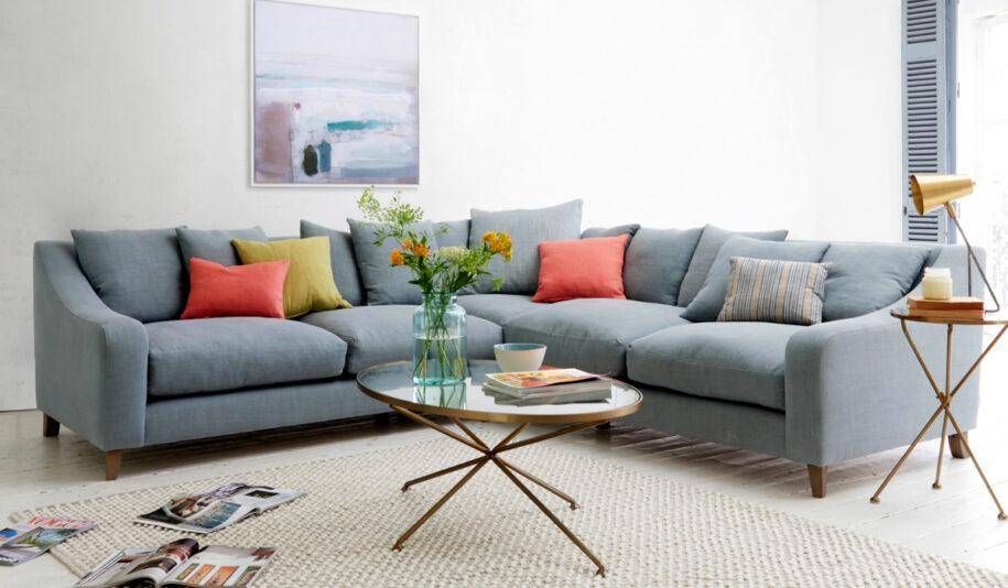 При установке в виде буквы «L» на расстоянии от стен или хотя бы от одной стены две софы могут служить инструментом зонирования или хотя бы зрительного расширения пространства.