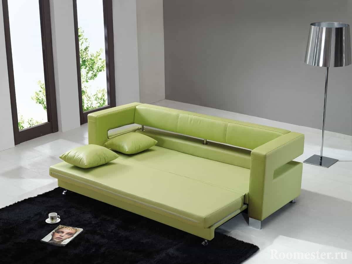 Книжка. Подобные классические варианты диванов, которые часто приобретают для гостиной, имеют не сложный механизм, посредством которого спинка опускается, превращая при этом конструкцию в двуспальное ложе. Данная система возникла практически первой и сегодня не утеряла востребованности.