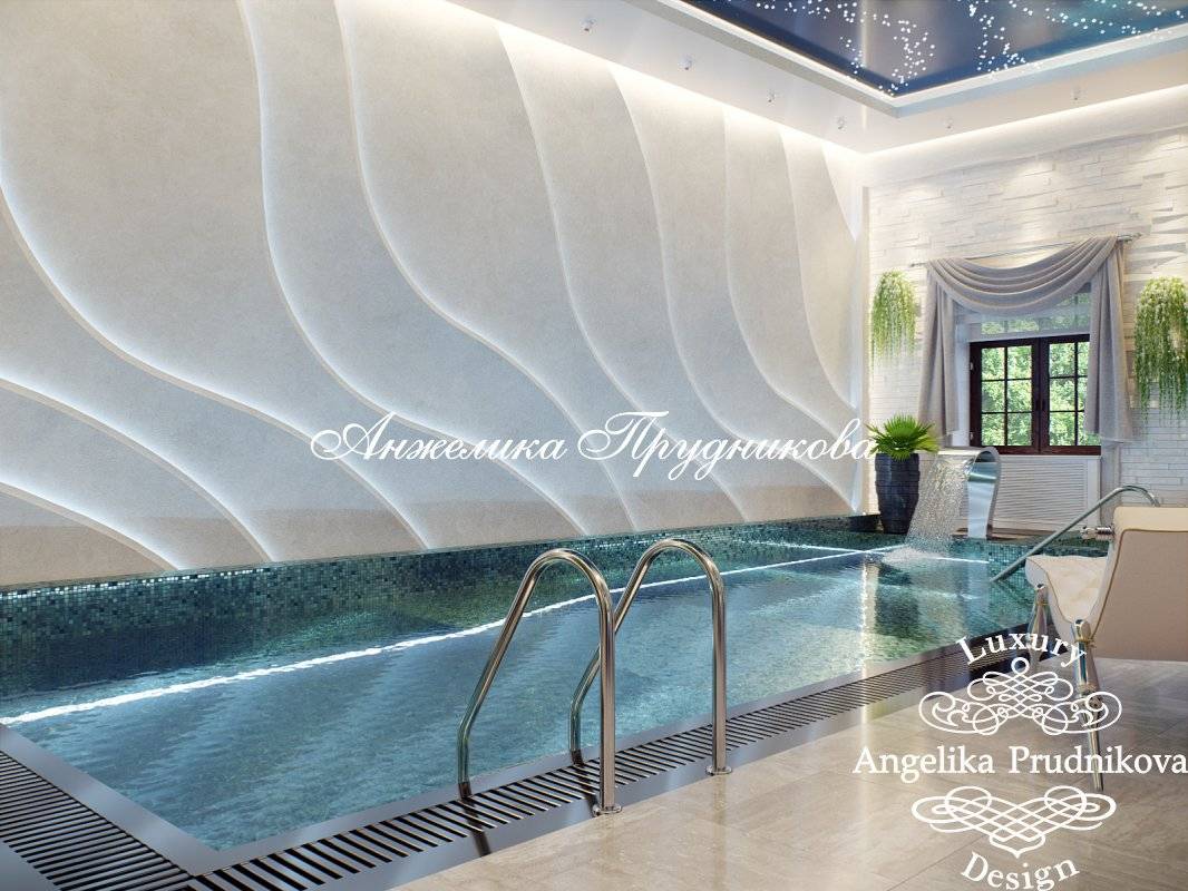 Мозаика и аккуратный, неброский узор на дне бассейна, мрамор, колонны, прямоугольная форма чаши, роскошная люстра — в оформлении всей зоны использованы элементы классического дизайна. Светлые тона также характерны для традиционного стиля и отлично вписываются в общую концепцию дизайна бассейна в элитном поселке «Миллениум Парк» в Москве.