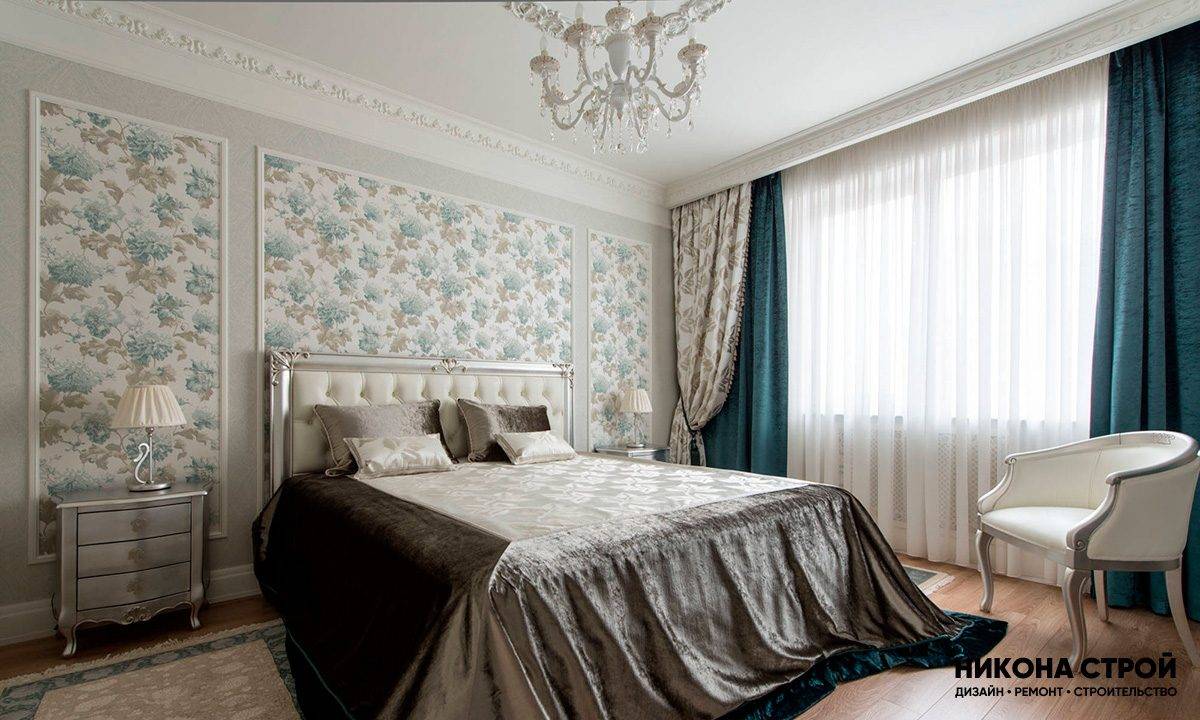Часть стен можно сделать однотонными, а другую частью сделать насыщенной богатыми узорами, такое сочетание сделает спальню завершенной и лаконичной. Идеальным вариантом будет выделить насыщенную часть с помощью лепнины. Непременно сочетайте ткани постельного белья и шторы с обоями, чтобы интерьер выглядел завершенным.