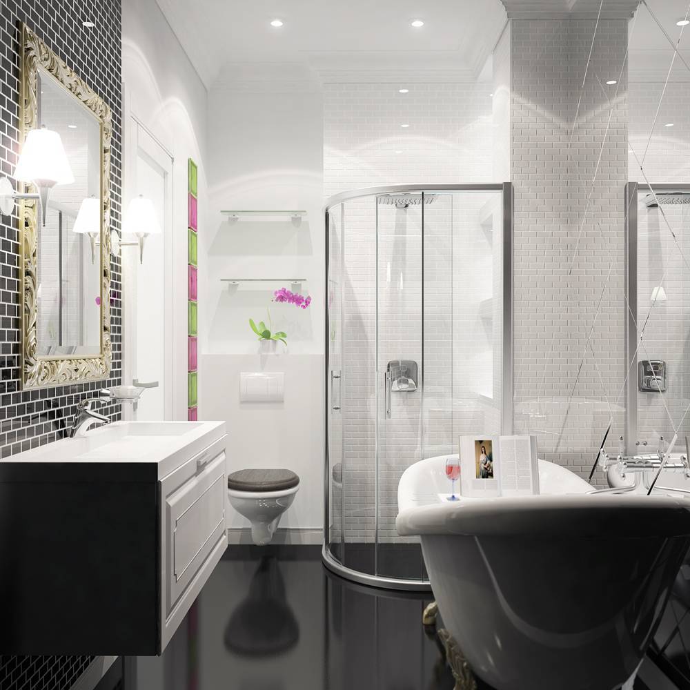 - Полностью белые стены, пол черного цвета, акценты в виде декоративных панно, бордюров, аксессуаров.