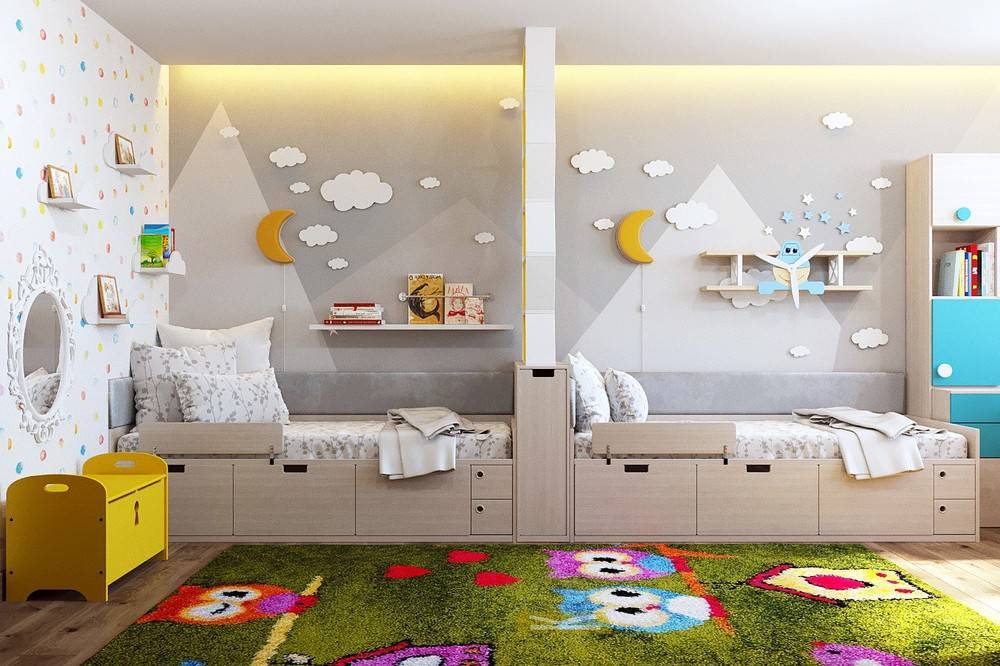 Двухуровневые кровати — хорошее решение меблировки детской разнополых детей. Из-за того, что у разнополых детей, как правило, различные увлечения, им нужно более четкое разделение пространства, особенно игровой зоны.