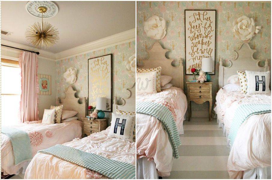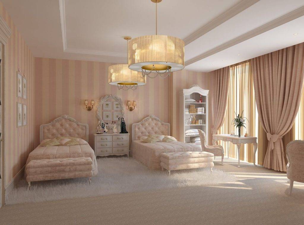 Дворцовый стиль спальни двух принцесс может выглядеть очень стильно и современно