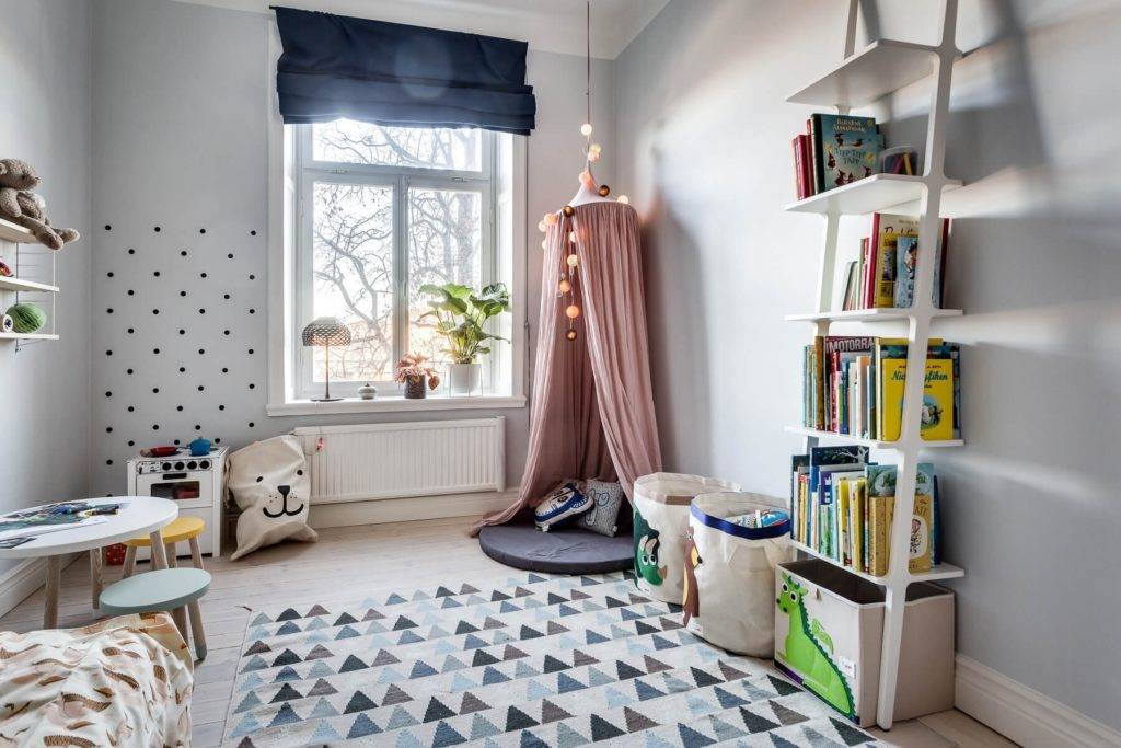игровая зона комнаты может быть общей для мальчика и девочки, но при этом важно выделить небольшой стеллаж или полку для каждого ребёнка, что позволит детям хранить свои игрушки раздельно, не путая их. В том случае, когда дети с большой разницей в возрасте, то старшему можно создать пространство для хобби в виде складного столика, полок и других подобных деталей;