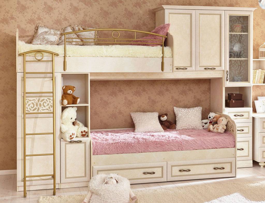 - установка двухъярусной кровати позволит сэкономить пространство и выделить зону отдыха для обеих девочек;