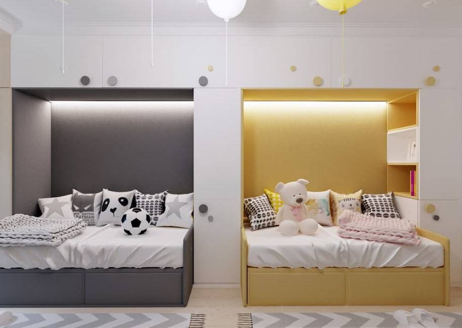 Без спальных мест в комнате не обойдешься. Когда это касается разнополых детей, вопрос становится сложнее. Даже если они еще совсем маленькие, в будущем каждому из двоих захочется иметь свой уголок, в который брату или сестре не будет доступа. Предусмотреть это следует заранее.