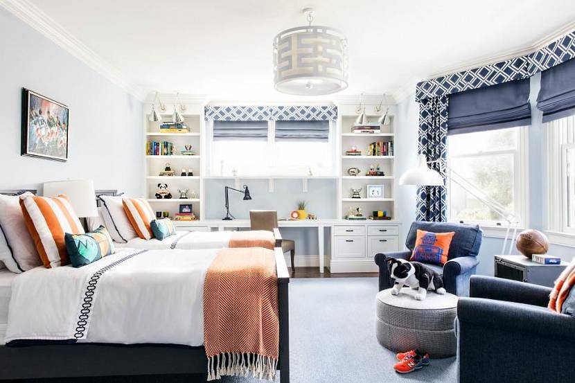 При планировании дизайна для детей старше 14 лет возникает потребность в многофункциональности. Комната для двоих детей чаще всего использует разделение по зонам, которое поможет создать нужные и эксклюзивные области для каждого ребенка. При распределении детской на блоки с целью создать индивидуальное место каждому жителю этой комнаты, не стоит использовать высокие стенки в качестве разделителя.