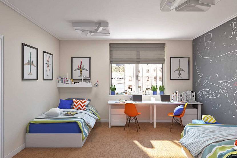 Расположение кроватей и другой мебели зависит от габаритов помещения, местонахождения входной двери. Например, дверь и окно напротив друга, следовательно, интерьер должен быть симметричным. Кровати и шкафы располагают вдоль боковых стен, а пространство можно разделить ширмой или матовой перегородкой. Также можно сделать общее спальное место (двухуровневая кровать). В этом случае вторую зону легко превращают в игровую, спортивную или учебную зону.
