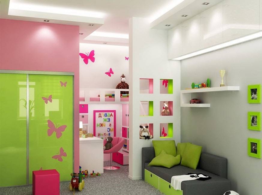 Для совсем крох стоит предпочесть зонирование пространства предметами интерьера, детям школьного возраста проще ориентироваться по цвету и декорациям, тем более засилье мебели может привести к травматизму.