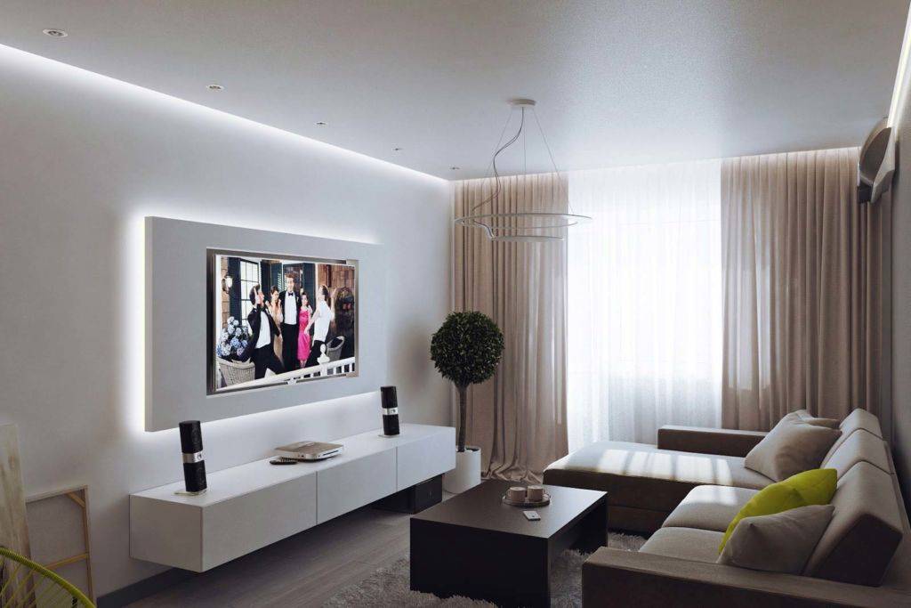 Традиционную мини-стенку можно заменить встроенным шкафом, а телеэкран установить на стену. Следование этим рекомендациям поможет разместить большее количество объектов при сохранении пространства для передвижения.