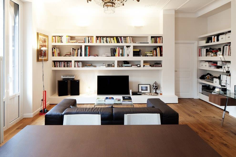 Системы хранения должны быть закрытыми, минимальное количество мебели, глянцевые поверхности фасадов, потолков и напольных покрытий. Здесь действительно не нужно много деталей и аксессуаров, но все материалы должны быть добротными и качественными. Не ДСП, а дерево, если пластик то дорогой, устойчивый к появлению царапин, без использования дешевых отклеивающихся пленок.