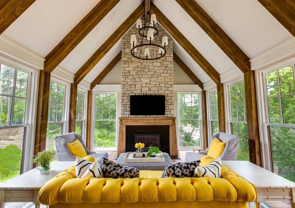 Сравнительно новой тенденцией в домашнем дизайне стал эко-стиль, который предлагает создавать обстановку, предельно приближенную к природе. В рамках данной художественной традиции гостиная 20 кв. м. с камином будет оформлена натуральными материалами и приобретет преимущественно древесную окраску. За комфорт и уют будут отвечать всевозможные одеяла, подушки и половики.