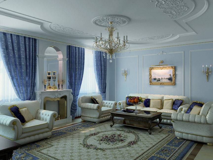 Морской цвет редко задействуется в классическом стиле гостиных и больше подходит для современных ванных комнат. Специалисты рекомендуют использовать его в качестве основного оттенка для стен и потолка, при условии, что в зале есть качественное освещение и доступ солнечных лучей. Синие тона больше применяют дозированно, в виде отдельных вкраплений на общем фоне другого цвета.