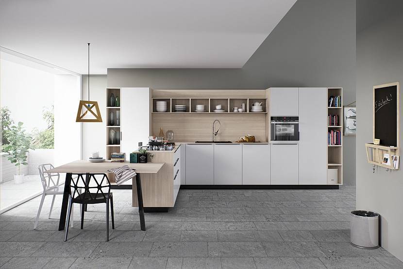 Здесь распространено сочетание белых стен и заметной мебели. Распространены шкафы с гнутыми фасадами. В целом дизайн лаконичный, функциональный; гладкие глянцевые поверхности предпочтительнее матовых. Акцентным элементом может служить фартук.