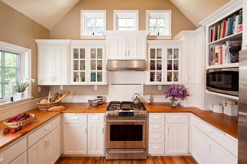 Если классические кухни белые, они смотрятся не столь нарядно и перегружено, что будет плюсом в малогабаритном помещении. В условиях недостатка пространства более уместным будет неоклассический дизайн.