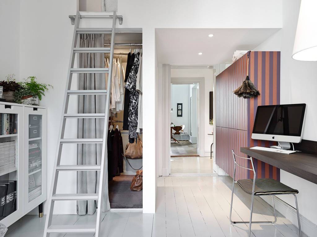 За эту идею стоит браться там, где площадь более 3 кв.м., потому что кабинет подразумевает продолжительное время работы человека в закрытом пространстве. А значит, места должно быть, как минимум, больше, чем в гардеробе или кухонном отсеке. В идеале должна получиться полноценная комнатка с рабочим столом, стулом, полочками и стеллажами.
