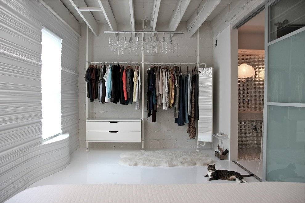 Гардеробная в углу между двумя дверьми позволить создать иллюзию отсутствия мебели, поскольку она идеально впишется в угол. Она интересно и необычно смотрятся модели с открытой системой хранения вещей.