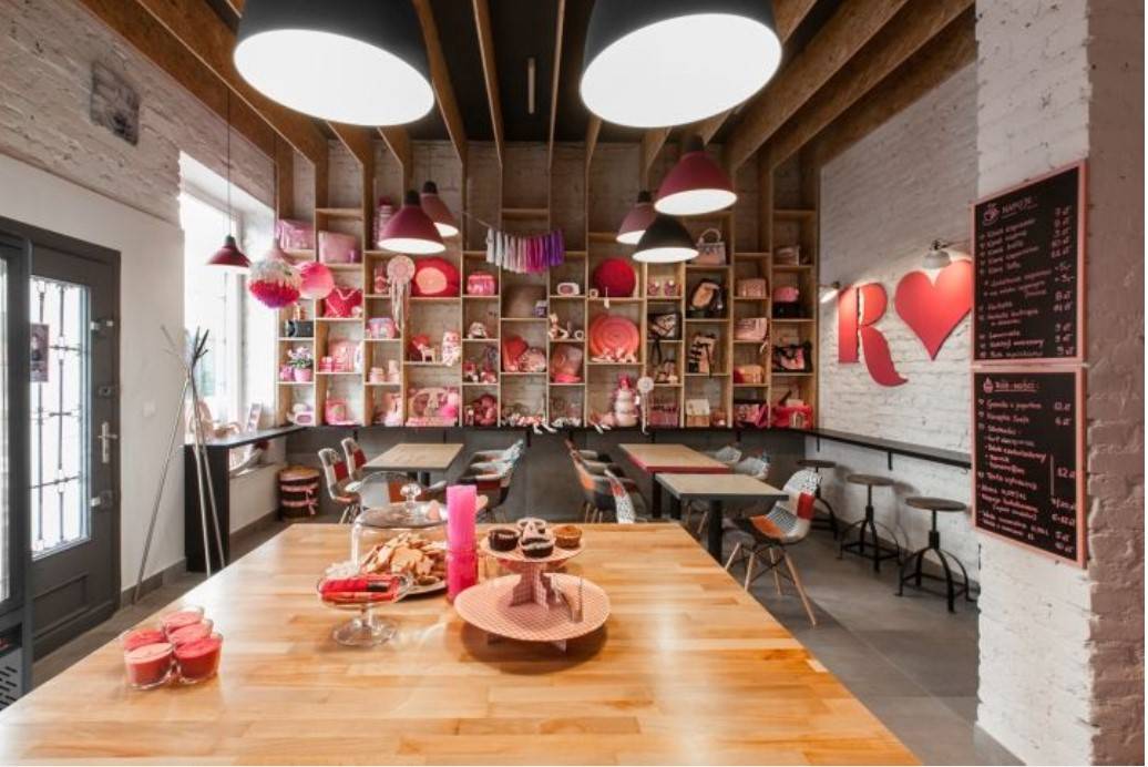 Достаточно просто расположить кафе в здании из кирпича, немного облицевать стены матовым лаком или яркой краской для большей эффектности, и привнести в дизайн отдельные детали, акцентирующие внимание