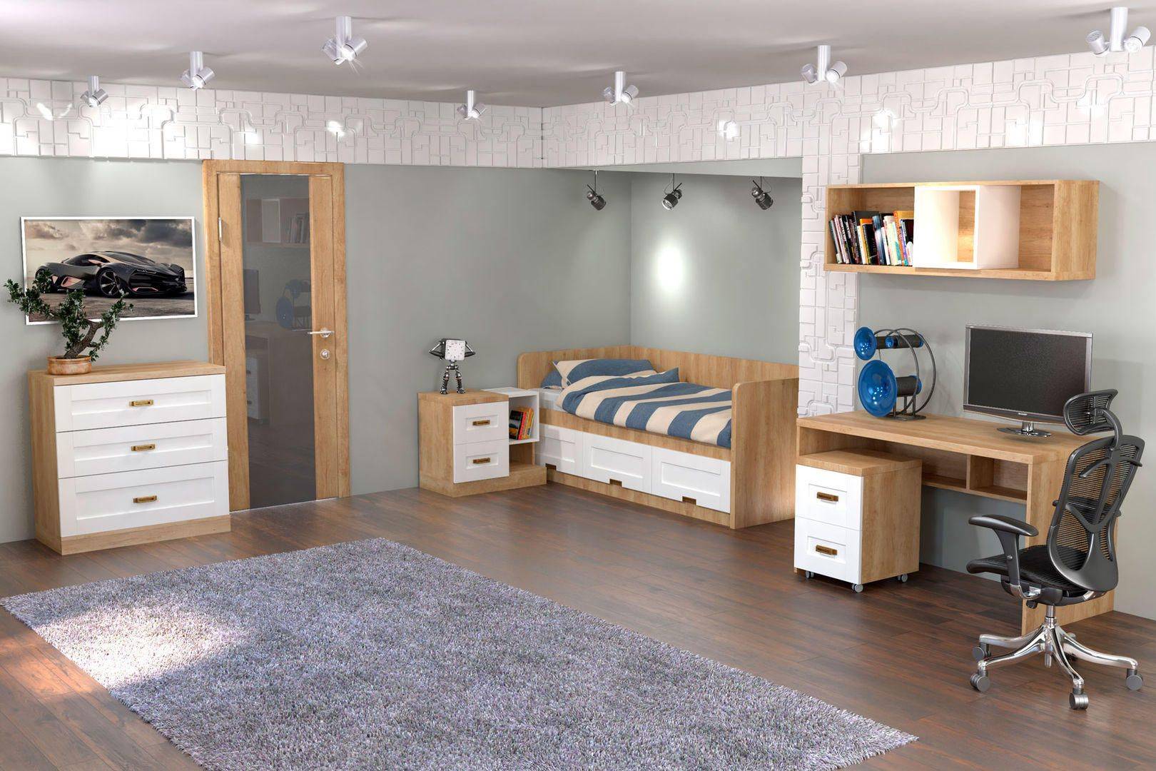 - Спальное место – прочная, комфортная кровать, которая обеспечивает оптимальную поддержку юношеского позвоночника. При подборе учитывают размер, тип основания, вид матраса, дизайн.