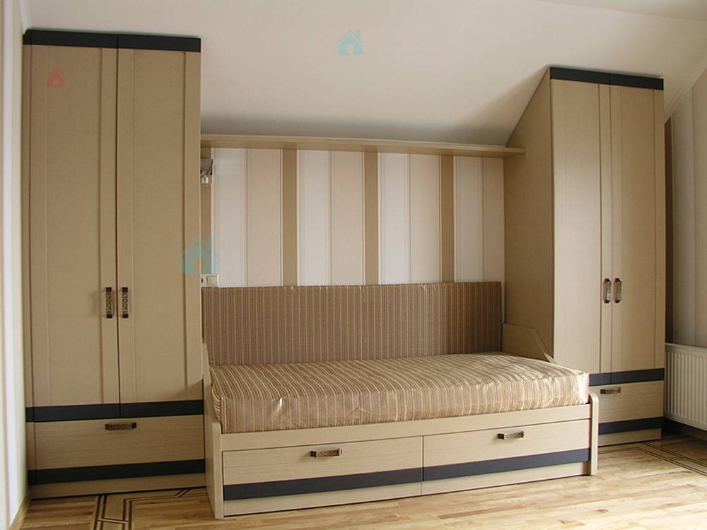 Идеальным решением для спального места станет размещение одноместной или полутораспальной кровати, которая может иметь фигурное, мягкое изголовье или даже спинку, оборудованную полками.