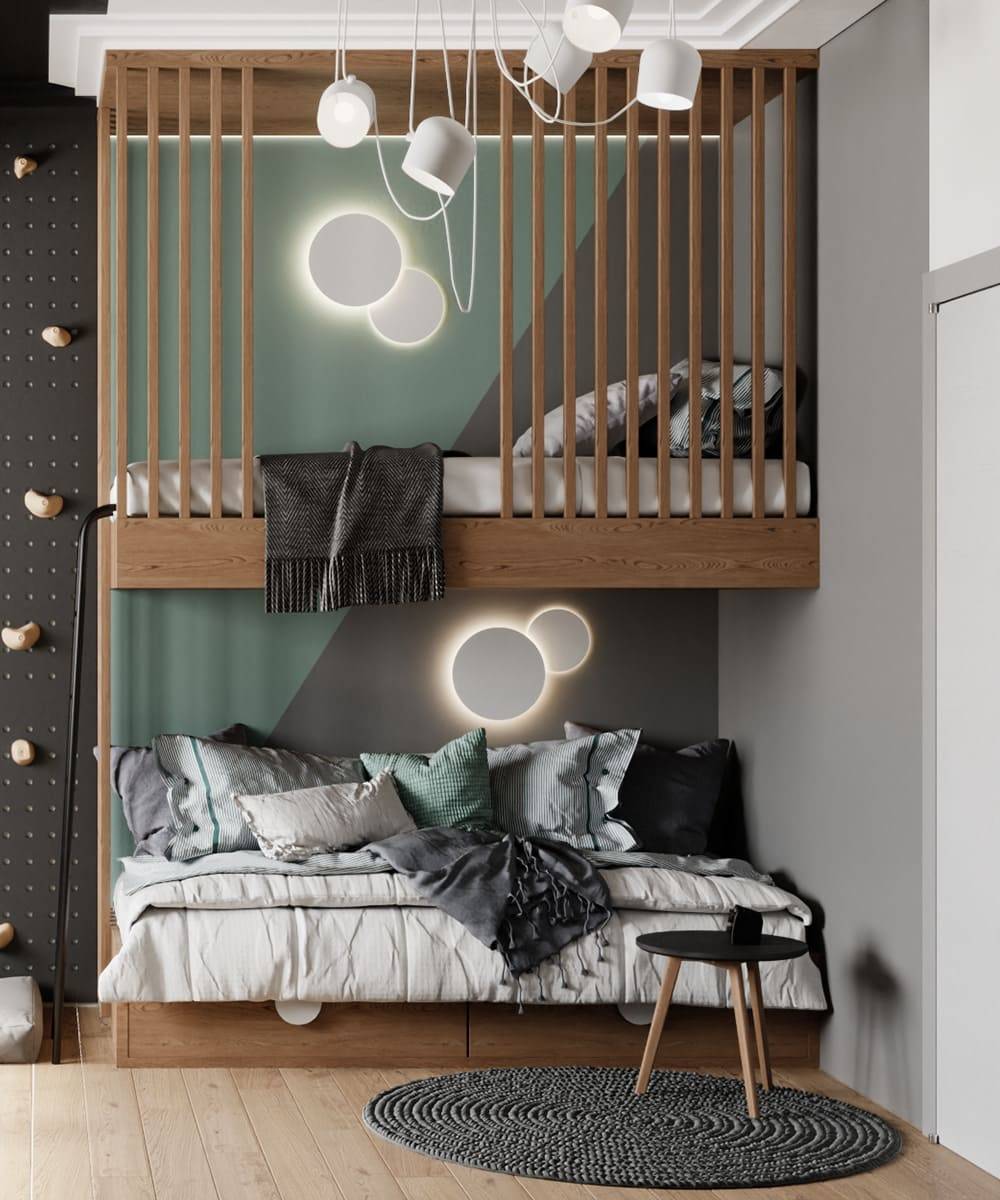 Для экономии пространства отлично подходит двухъярусная кровать. Она освободит значительную часть площади, которую можно отвести под стол или спортивную зону. Такие кровати бывают: