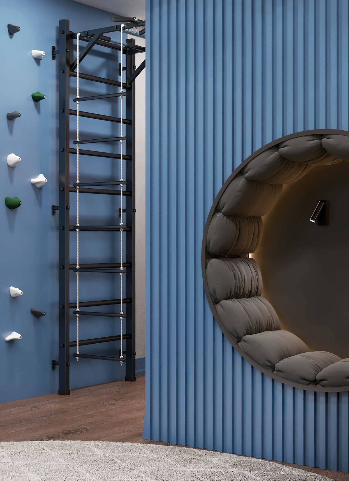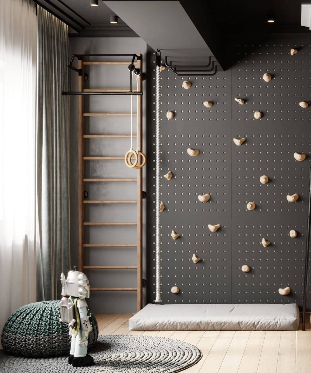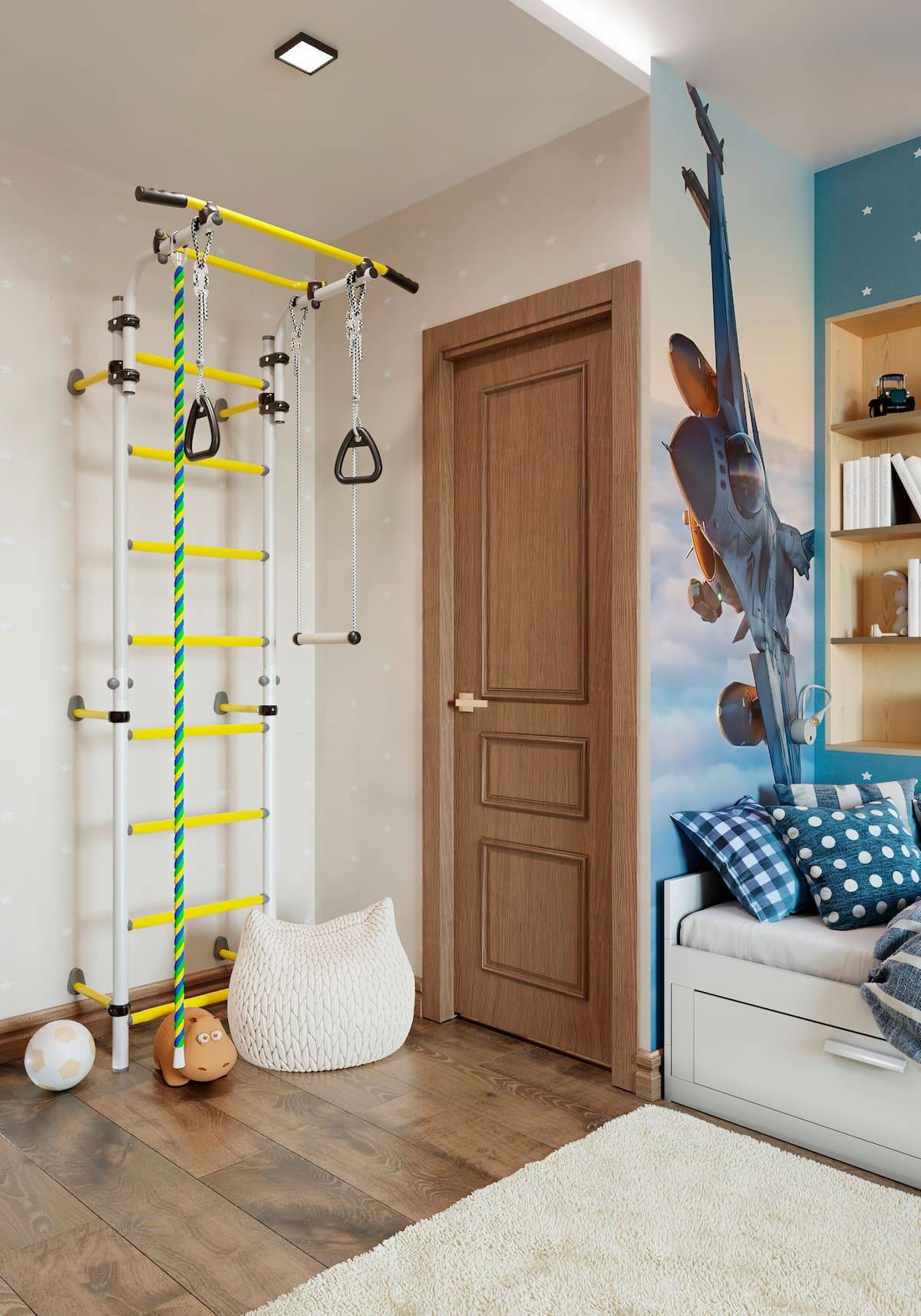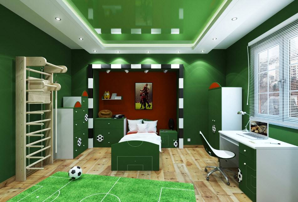 - Спорт. Многие мальчики увлечены просмотром различных состязаний, занимаются самостоятельно спортом. Интерьер детской комнаты, связанный с тренировками, символикой, известными спортсменами, признается стимулирующим волю к победе, командный дух. Цветовая гамма тематической группы: яркие, волевые краски, повторяющие известные спортивные символы.
