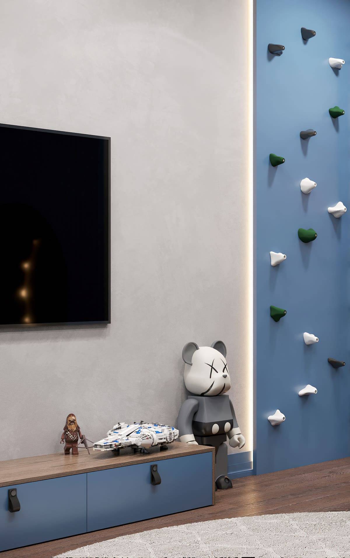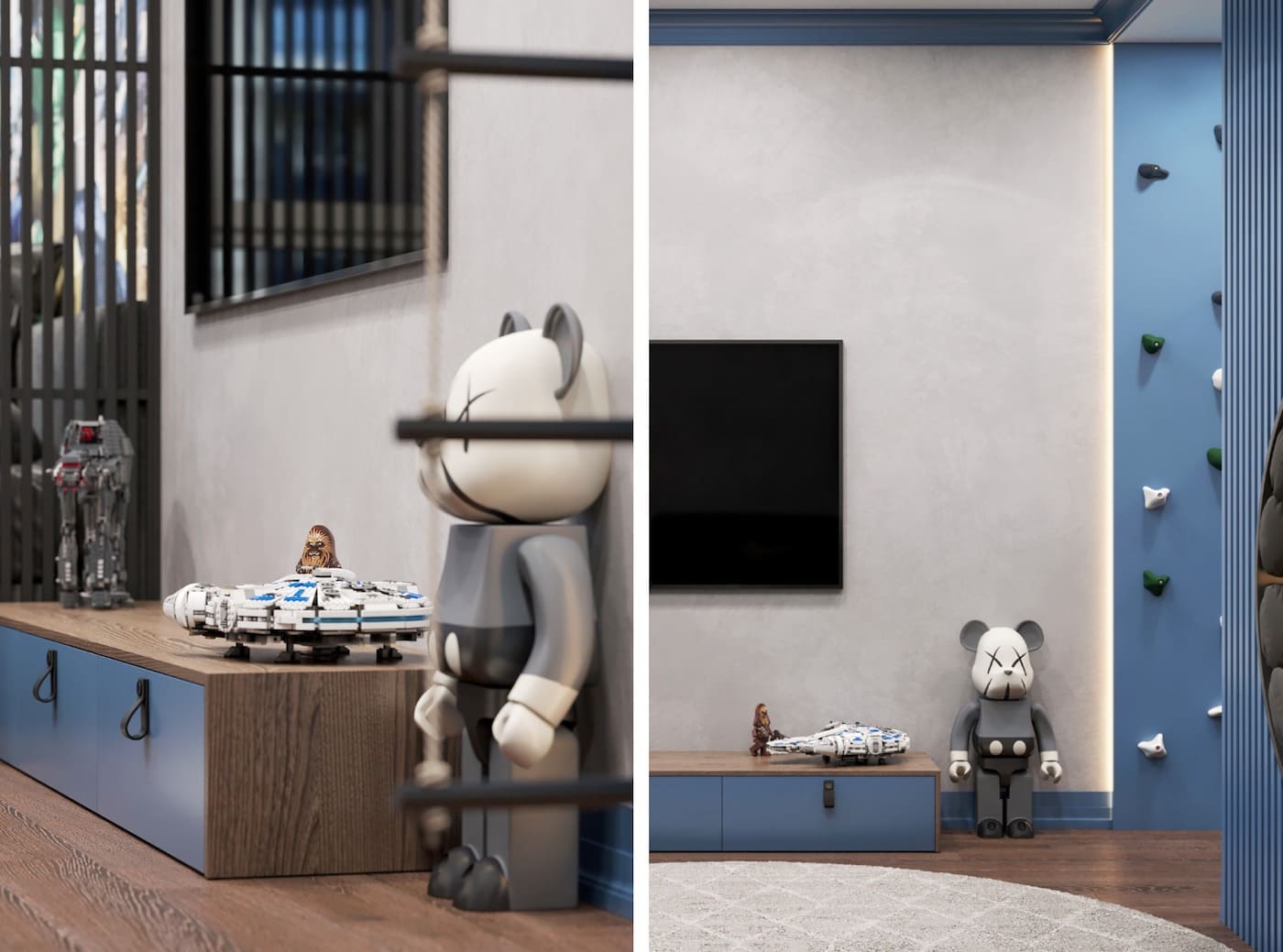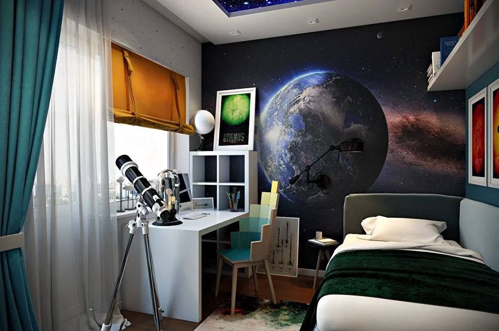 Космический стиль – идеальное решение для детей дошкольного или школьного возраста. Цветовая гамма – сочетание синего, белого и серого цветов, потолок – подвесная конструкция с эффектом звездного неба.