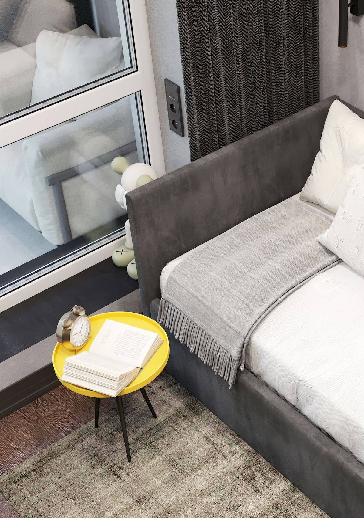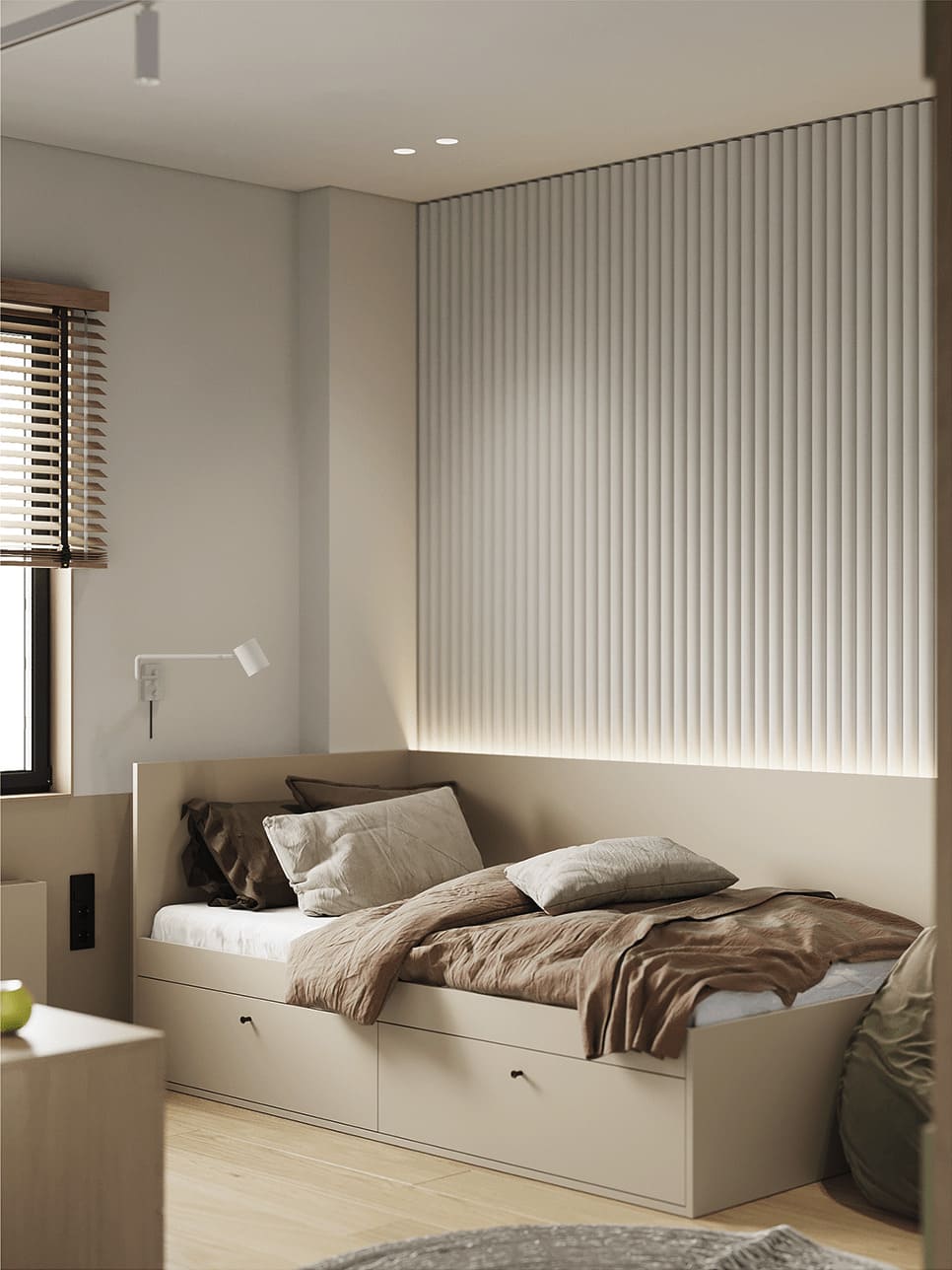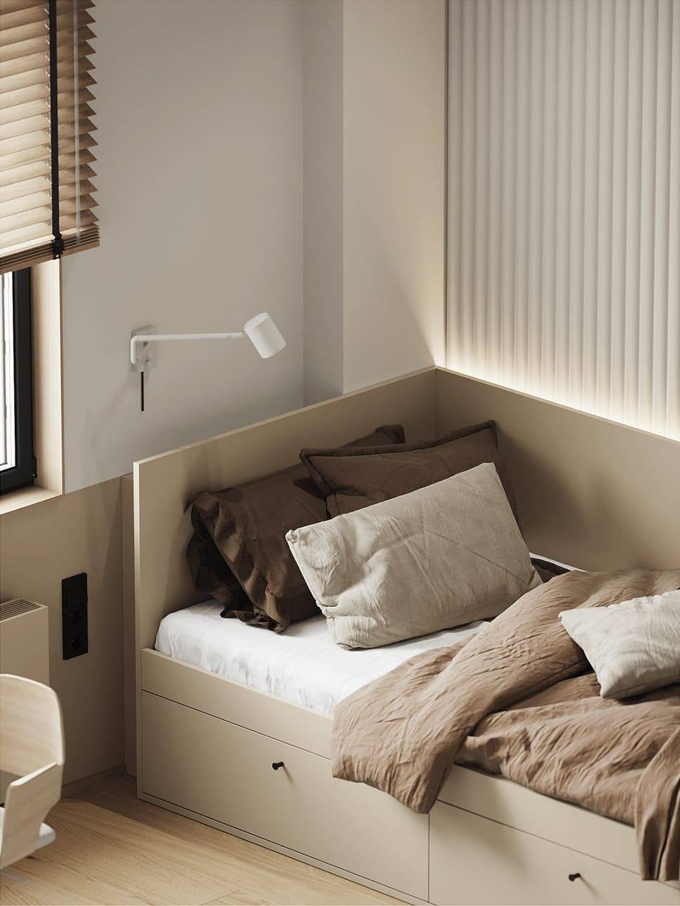 - Кровать. Она должна быть просторной и удобной. Выдвижные ящики сэкономят место и организуют пространство. Кровать можно заменить на диван-кровать, который легко разобрать на ночь.