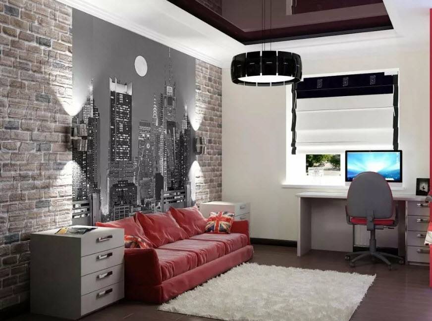 Лофт – идеальное решение для подростков и школьников. Ключевая особенность интерьера – кирпичная стена и наличие серого цвета в отделке.