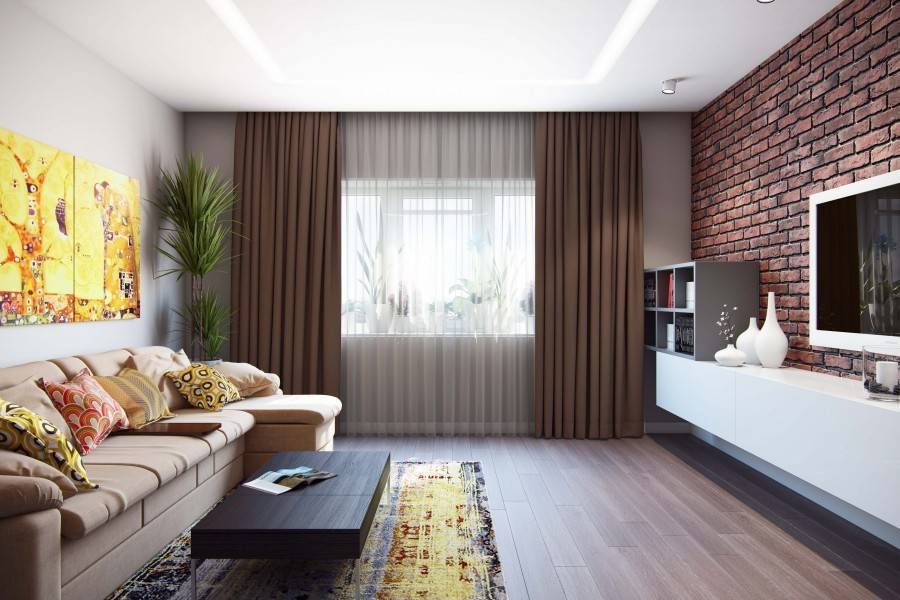 Восприятию пространства такое зонирование не повредит, даже наоборот, позволит увеличить комнату в ширину, приблизив ее форму к квадратной. Для жилья со сложной геометрией стен, придется экспериментировать в проекте, пробуя разные варианты, чтобы исключить подчеркивание недостатков. В квадратных комнатах разделение проводят либо частично у одной стены, либо симметрично на обоих, оставляя широкий проход между разграничителями. Условное зонирование в свою очередь может осуществляться с помощью света, цветовых комбинаций, подиума и разных фактур поверхностей отделочных материалов. К примеру, спальную зону декорируют искусственным кирпичом светлого оттенка в стиле лофт, а гостиную штукатурят или оклеивают обоями. Кстати, поверхности с крупными принтами для небольших комнат попадают под табу. Если и использовать узоры, то только мелкие повторяющиеся.