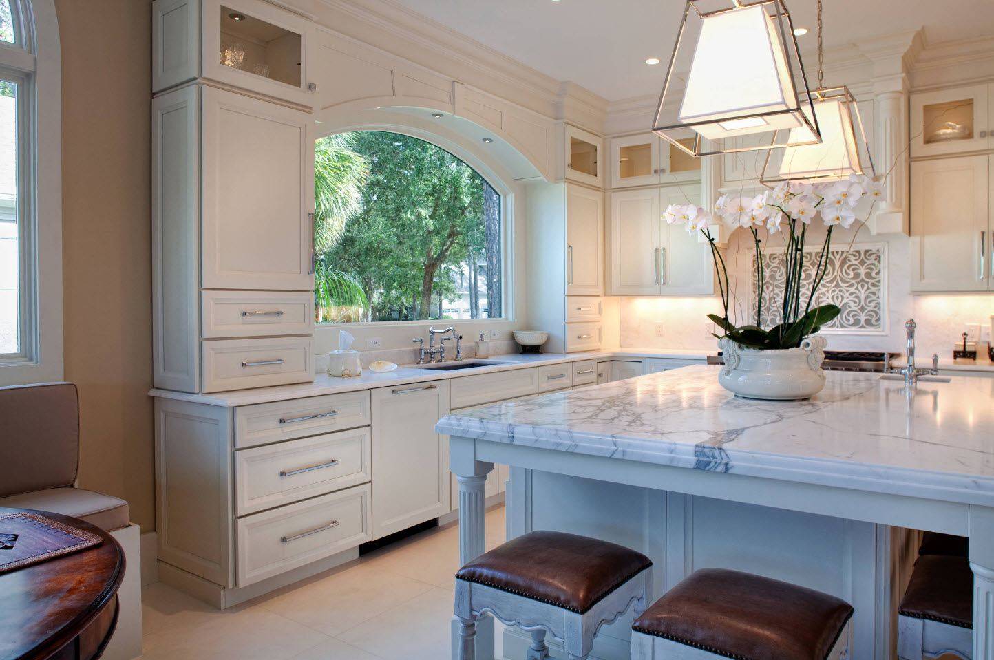 На просторной кухне самое место гарнитуру с островом. Он делает ее удобнее в использовании и преображает интерьер. Острова бывают самых разных конфигураций — круглые, квадратные, имеющие асимметричные очертания. Этот блок часто устанавливается по центру. Он может служить полноценным обеденным столом, в него устанавливают технику, нагружают другими кухонными функциями.