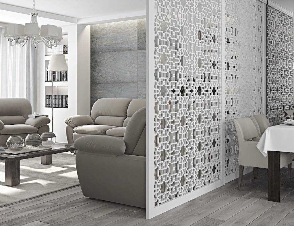 Разделить помещение на зоны вам помогут декоративные перегородки. Это очень красивый элемент интерьера, который к тому же может быть и функциональным. Конструкция с отверстиями для сувениров и других аксессуаров украшают каждую зону, являясь в тоже время их разделением.