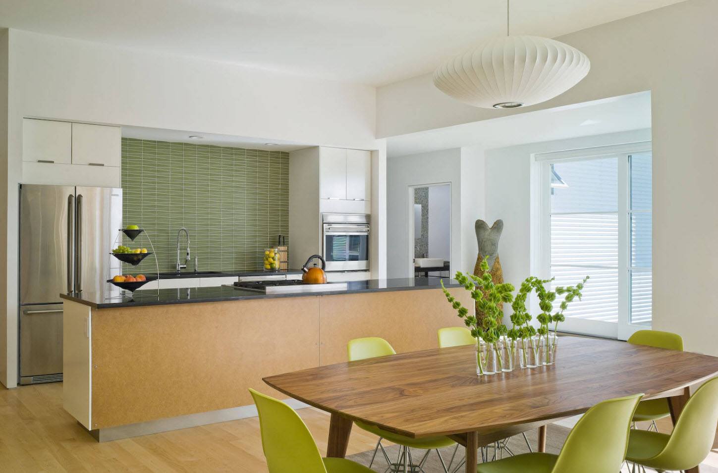 Прием зонирования пространства помогает отделить столовую от кухни. Самый простой способ – это визуальное выделение, к примеру, как на фото – установить обеденный гарнитур немного в стороне от рабочей зоны.