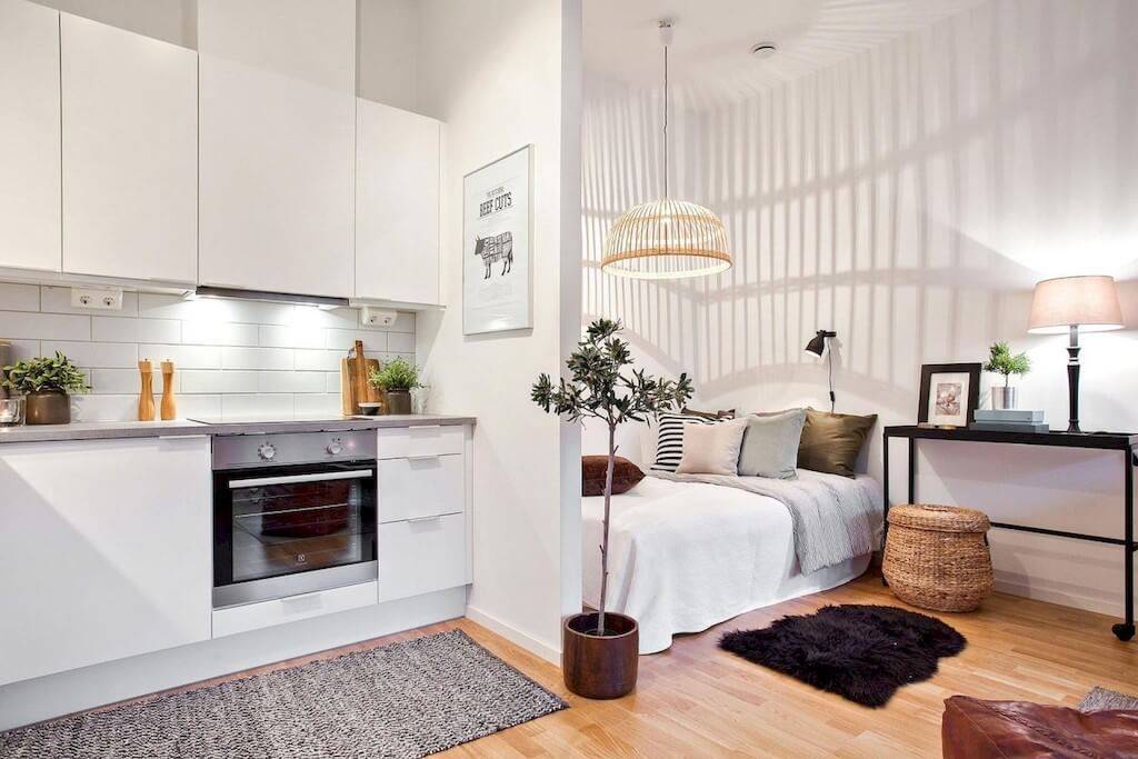 При обустройстве кухни-спальни вам не обойтись без декоративной перегородки. Ведь согласитесь, кровать радом с плитой будет выглядеть как минимум странно и испортит композицию.
