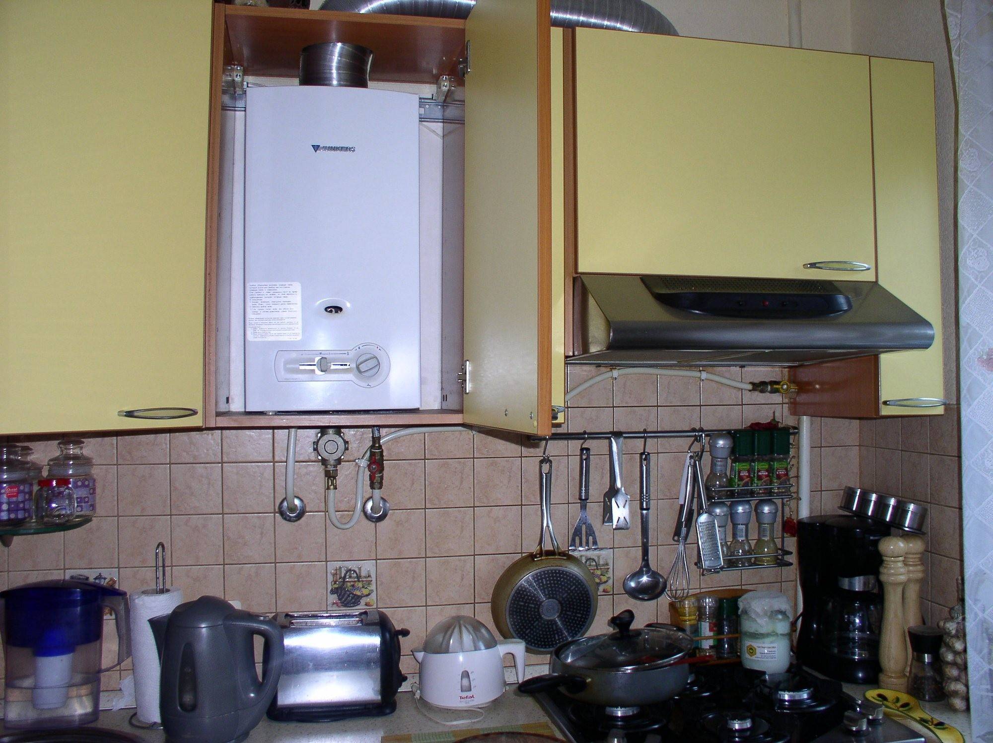Подбирая мебель для компактной кухни лучше отдать предпочтение наборам с небольшими подвесными шкафчиками. В один из них можно «спрятать» газовую колонку – частый атрибут квартир — «хрущевок».