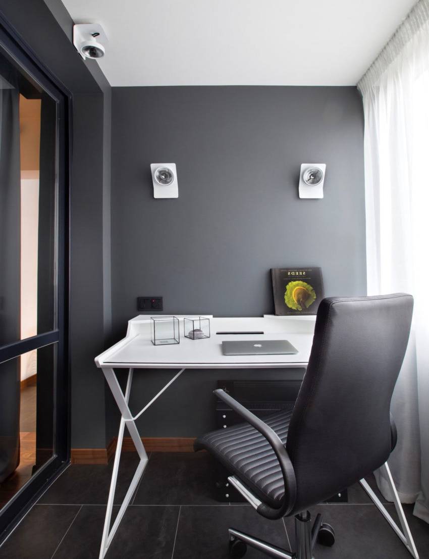 В двухкомнатной квартире в 45 м2 одну из комнат можно оборудовать под кабинет. Для этих целей лучше выбрать маленькую комнату и отремонтировать ее в офисном стиле, чтобы ничего не мешало работе. Если же в квартире надо оставить 2 жилые комнаты (для ребенка и родителей), то можно пойти на хитрость и уменьшить большую комнату, т.е. разделить ее перегородкой из гипсокартона. В итоге получится 2 комнаты ориентировочно по 10-12 метра с окнами и 1 комната в 6-8 метров без окна. Именно из последней и делается кабинет. Для рабочей зоны окно необязательно. Подобная планировка подойдет и для однушек, только в итоге выйдет 2 комнаты: с окном и без. В кабинете даже не надо ставить диван. Достаточно поставить высокие шкафы с книгами и нужными документами, а также компьютерный стол со стулом. Поскольку кабинет выйдет без окна, то нужно побеспокоиться об освещении. Большую люстру вешать не стоит, подойдут: