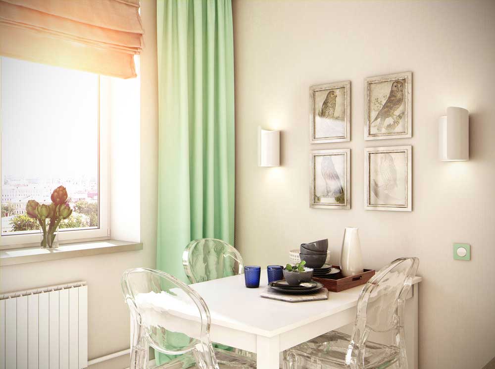 Лучше выбирать короткие шторы — длинные будут часто пачкаться и загромождать помещение. Можно использовать римские шторы или скомбинировать их с короткими тканевыми. Цвет будет зависеть от того, делается акцент на шторах или нет, но нередко подбираются яркие тона.