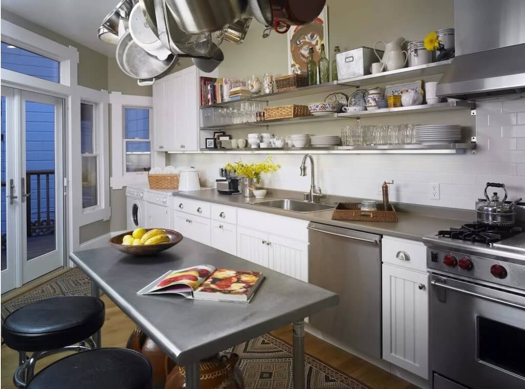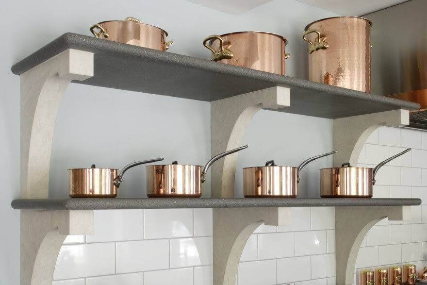 Самое главное при выборе полки — найти текстуру, которая будет гармонировать с общим интерьером кухни. Например, глянцевые стальные полки подходят только для современных стилей, таких как фьюжн, минимализм и хай-тек.