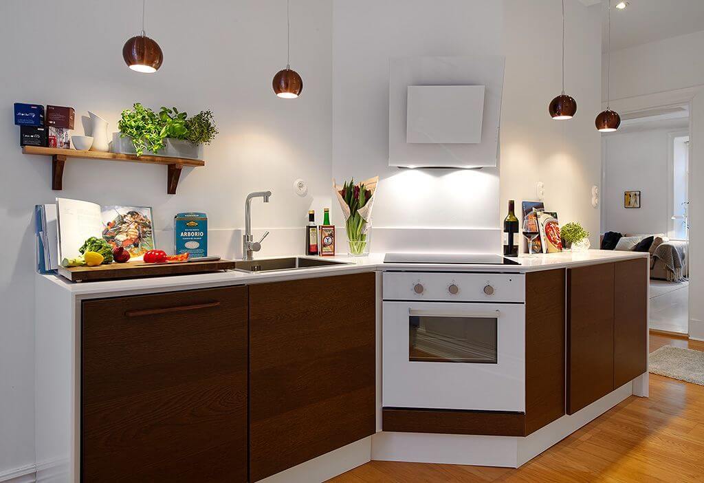 6. С помощью… навесных шкафов – и наконец, вы можете выбрать линейный, угловой или П-образный одноярусный гарнитур и повесить навесные модули лишь вдоль одной стены или вовсе локально.