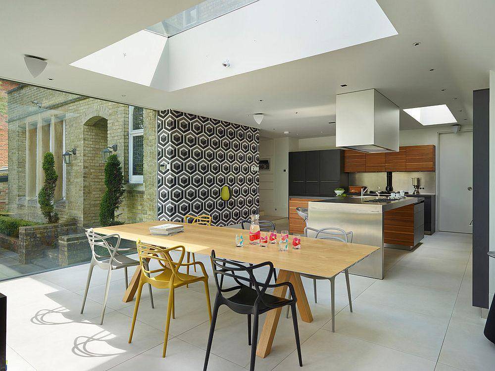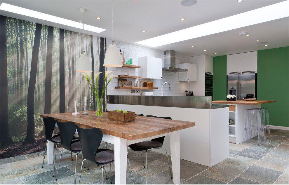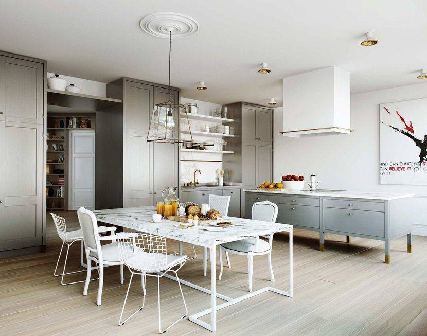 Другое популярное решение это разделение кухни и гостиной при помощи обеденного стола. Такой вариант больше подойдёт для просторных гостиных комнат, так как обеденный стол и стулья занимают гораздо больше места чем узкая барная стойка.