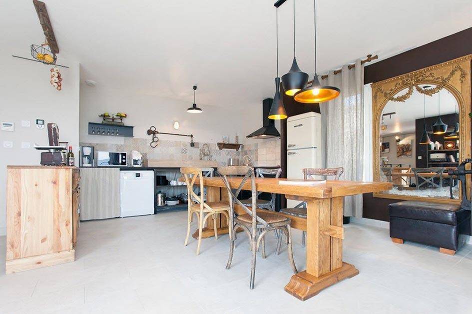 Одним из самых удачных решений для оформления кухни-студии будет стиль лофт. Это современный промышленно-урбанистический стили интерьера, характерными чертами которого является наличие индустриальных элементов (высокие потолки, кирпичные стены, балки и трубы на виду, цементный пол).
