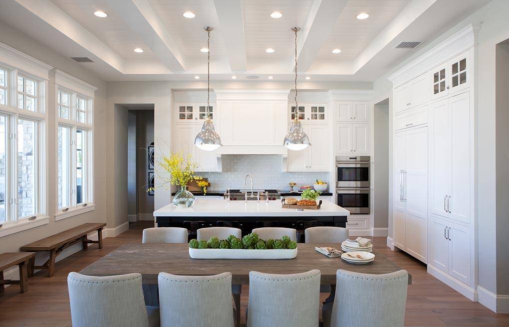 - Аналогичным образом делить помещение может и потолок: многоуровневые конструкции над гостевой частью отделят ее от кухни.
