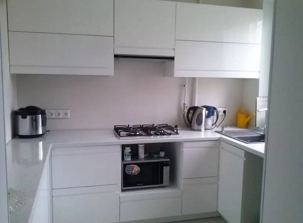 Если кухня узкая, лучше расположить фасады без фурнитуры. В угловые ниши лучше вмонтировать выдвижные карусели, что даст возможность по максимуму задействовать ранее не задействованную зону. Столешницу над угловой тумбой можно использовать под мелкую технику.