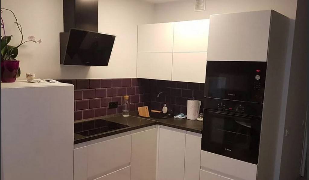 Угловая организация пространства повышает скорость готовки: все необходимые предметы и продукты расположены под рукой. Посмотрите, как удачно хозяева этой кухни сумели установить бытовую технику в гарнитур.