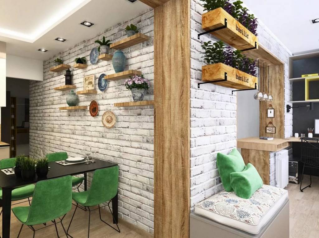 В рабочей зоне можно установить более практичные износостойкие материалы (керамическая плитка, водоустойчивый ламинат). А вот в зоне отдыха можно расположить более красивую, хоть и менее износостойкую отделку (ковролин, обои и т.д.). Различие оттенков, фактур при правильном подходе пойдет на пользу интерьеру.