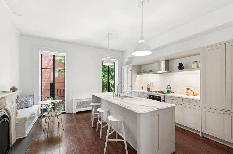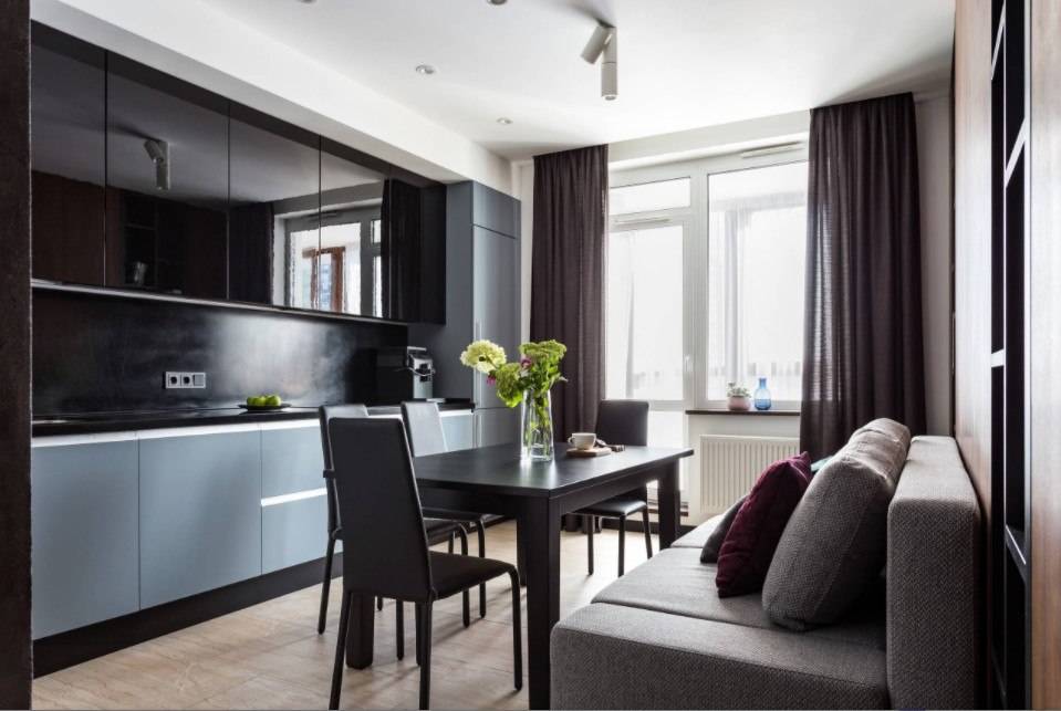 В таком помещении можно установить кухонный остров со стеллажами для посуды и утвари. Если у вас большой балкон или лоджия, там логичнее всего устроить обеденную зону. Хотите уютную зону отдыха? Выделите уголок для компактного дивана или пары стильных кресел.