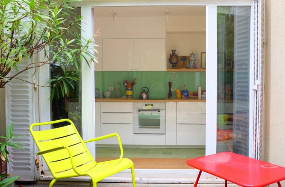 - Также можно установить на границе раздвижные прозрачные двери из закаленного стекла. Такой современный элемент будет одновременно и украшением интерьера, и полноценной перегородкой. Это очень удобно, если на балкон вынесена зона отдыха, где кто-то из членов семью любит работать или читать. В любой момент дверь можно закрыть и уменьшить количество шумов, которые могут сопутствовать процессу приготовления пищи или уборке;